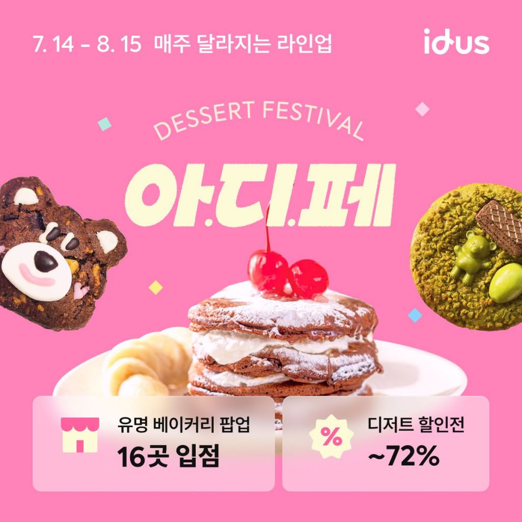 아이디어스는 이번 온라인 팝업 개최를 기념해 다양한 할인 혜택을 마련했다. ▲첫 구매 고객 대상 2000원, d+ 멤버십 회원 전용 할인 쿠폰 제공 ▲최대 72% 디저트 할인전 ▲매일 낮 12시 선착순 혜택 ▲인기 디저트 증정 '기념일 등록 이벤트' 등이 있다.