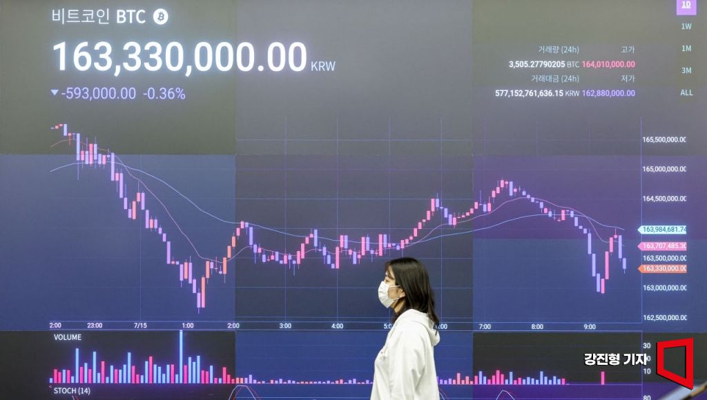 비트코인이 사상 최고가인 12만달러(약 1억6545만원)를 돌파하며 강세를 이어가고 있는 가운데 15일 서울 강남구 업비트 고객센터 전광판에 비트코인 시세가 표시돼 있다.