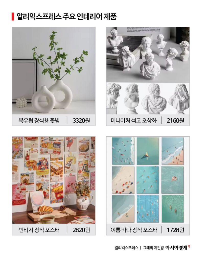 가격 경쟁력도 뛰어나다. 벽 꾸미기에 활용되는 패브릭포스터의 경우 국내 플랫폼에서 1만원대지만, 알리에선 4000~5000원대로 반값이다. 북유럽풍 꽃병 장식은 알리에서 3000원대에 구매할 수 있다. 인테리어 제품은 통상 계절별로 분위기를 바꾸기 위해 구매하는 만큼 방대한 상품군과 저렴한 가격이 강점으로 작용한 것이다.
