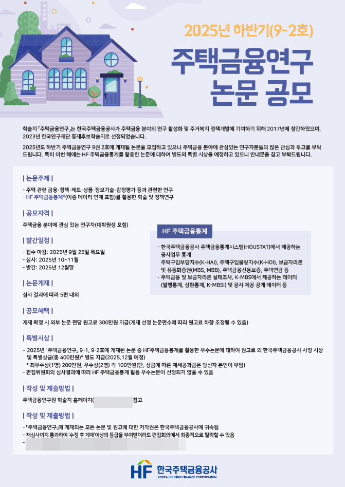 한국주택금융공사(사장 김경환)가 주거복지 정책 개발과 주택금융 분야의 학술연구를 촉진하기 위한 '2025년 하반기 주택금융연구 논문 공모전'을 개최한다.