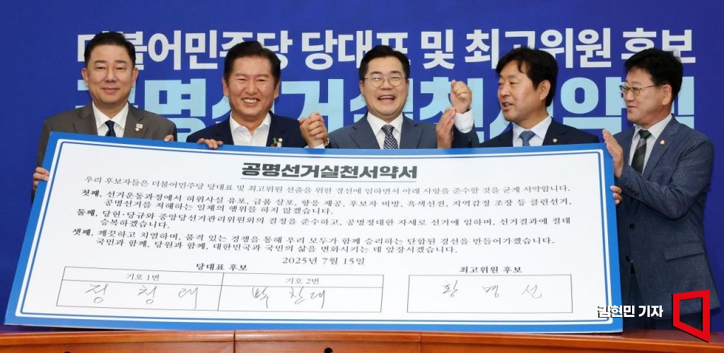 정청래·박찬대 더불어민주당 당대표 후보와 황명선 최고위원 후보가 15일 국회에서 열린 공명선거 실천 서약식에서 기념촬영을 하고 있다. 왼쪽부터 김병기 당대표 직무대행 겸 원내대표, 정청래·박찬대 당대표 후보, 황명선 최고위원 후보, 김정호 중앙당선거관리위원장.