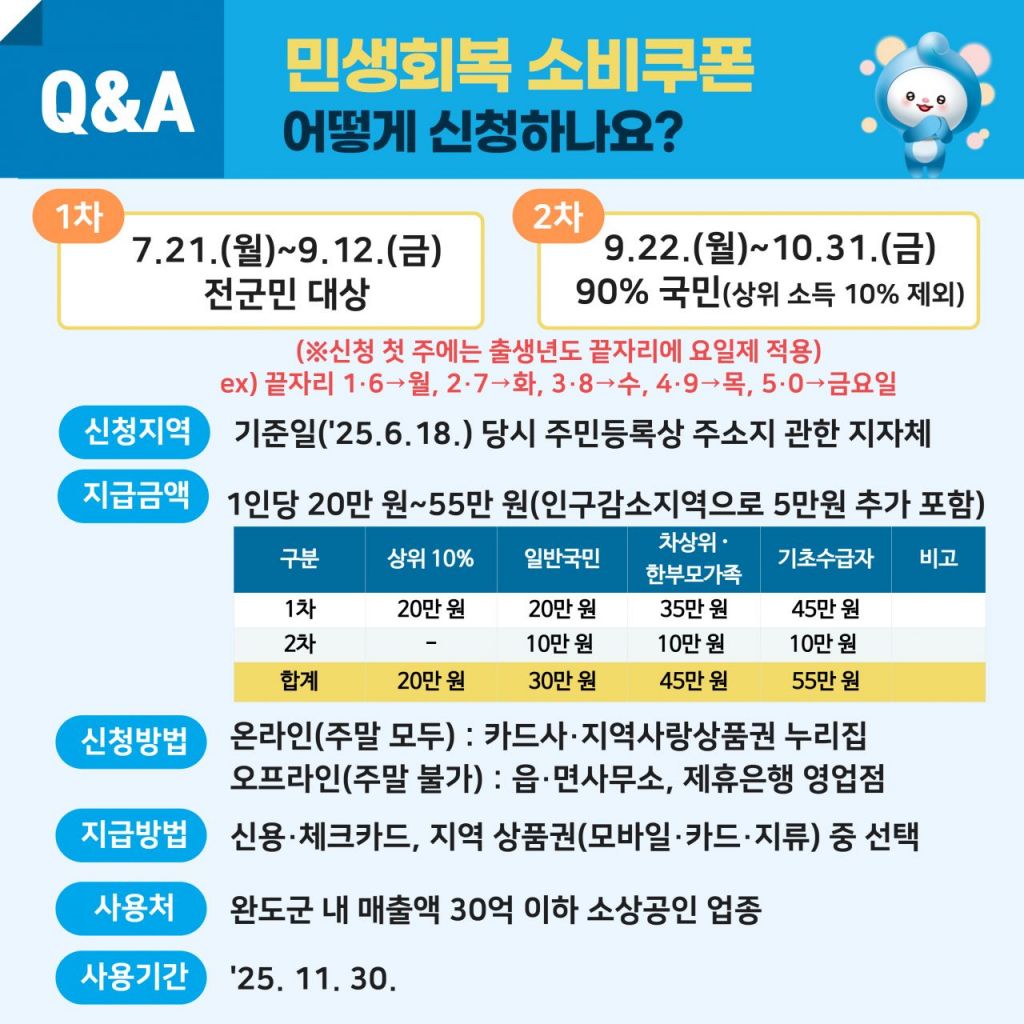 전남 완도군은 오는 21일부터 9월 12일까지 '민생회복 소비쿠폰' 1차 신청을 받는다고 15일 밝혔다.