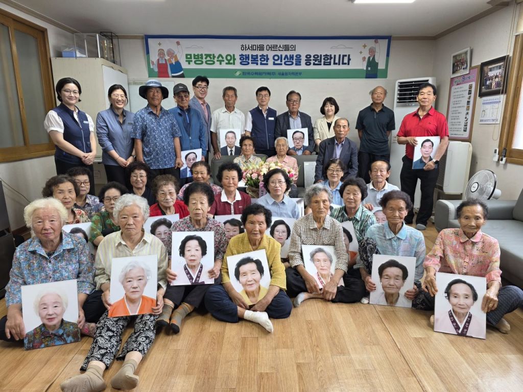 이날 행사에서는 뉴시스 소속 사진기자의 재능기부로 사전 촬영한 장수사진(38명)과 100세 장수어르신을 위한 여름보양식 밀키트 세트를 전달하고 마을회관 환경 개선을 위한 편의물품 지원도 함께 진행했다.