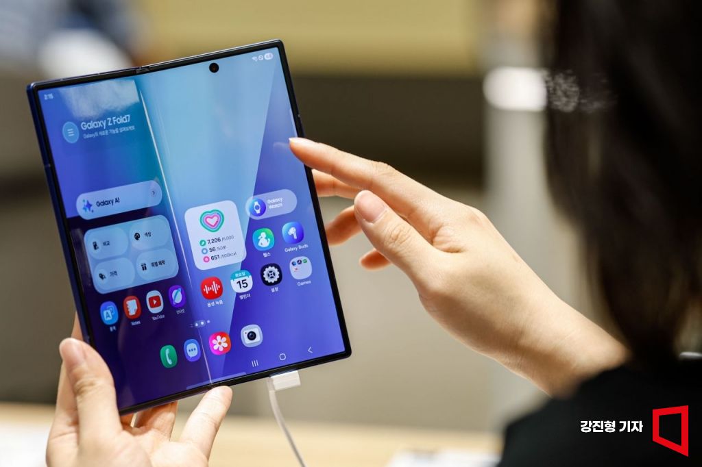 15일 서울 종로구 KT플라자 광화문중앙점을 찾은 고객이 삼성전자 '갤럭시 Z 폴드7'을 체험하고 있다. KT는 15일부터 21일까지 전국 KT 매장과 KT닷컴에서 '갤럭시 Z 폴드7'과 '갤럭시 Z 플립7' 사전 예약을 진행한다고 밝혔다.
