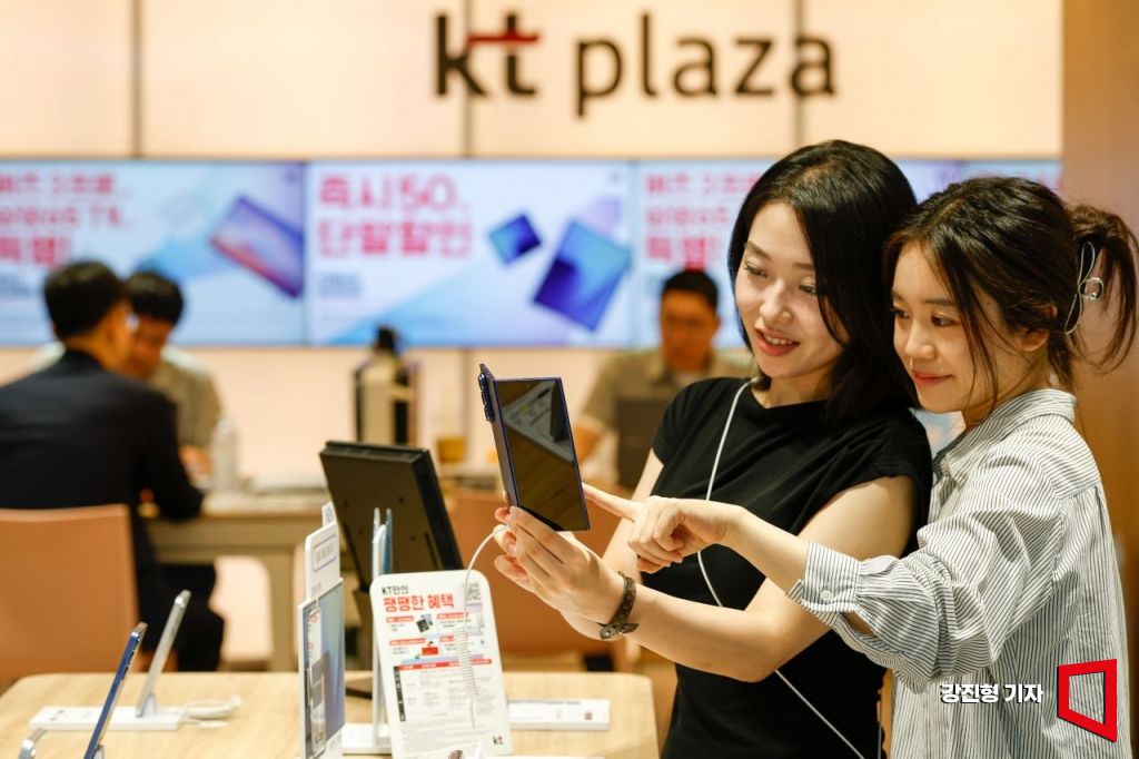 15일 서울 종로구 KT플라자 광화문중앙점을 찾은 고객이 삼성전자 '갤럭시 Z 폴드7'을 체험하고 있다. KT는 15일부터 21일까지 전국 KT 매장과 KT닷컴에서 '갤럭시 Z 폴드7'과 '갤럭시 Z 플립7' 사전 예약을 진행한다고 밝혔다.
