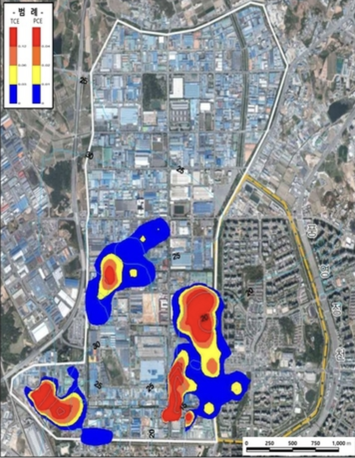 조사 결과, 171개 지점에서 심도별로 채취한 지하수 시료 657개 중 184개에서 트라이클로로에틸렌(TCE)과 테트라클로로에틸렌(PCE)이 기준치를 초과한 것으로 나타났다. 오염이 특히 심각했던 지역 5곳(Zone 1~5)을 정밀 조사한 결과, TCE는 기준치의 466배, PCE는 284배에 달하는 수치가 확인됐다. TCE와 PCE는 금속 세정제, 드라이클리닝, 농약 원료 등에 사용되는 유기염소계 화합물로, 흡착력이 낮고 발암성이 있는 무색 액체다.