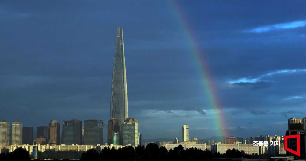 15일 오후 서울 지역에 세찬 소나기가 지나고 난 후 잠실 서울스카이 옆으로 이쁜 무지개가 걸렸다.