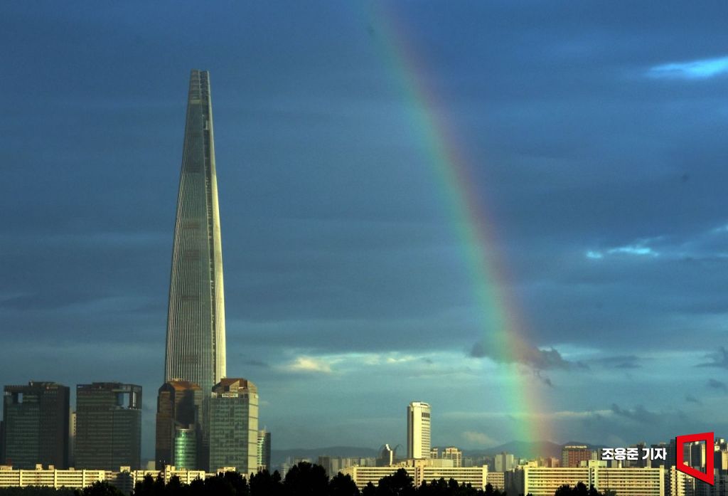 15일 오후 서울 지역에 세찬 소나기가 지나고 난 후 잠실 서울스카이 옆으로 이쁜 무지개가 걸렸다.
