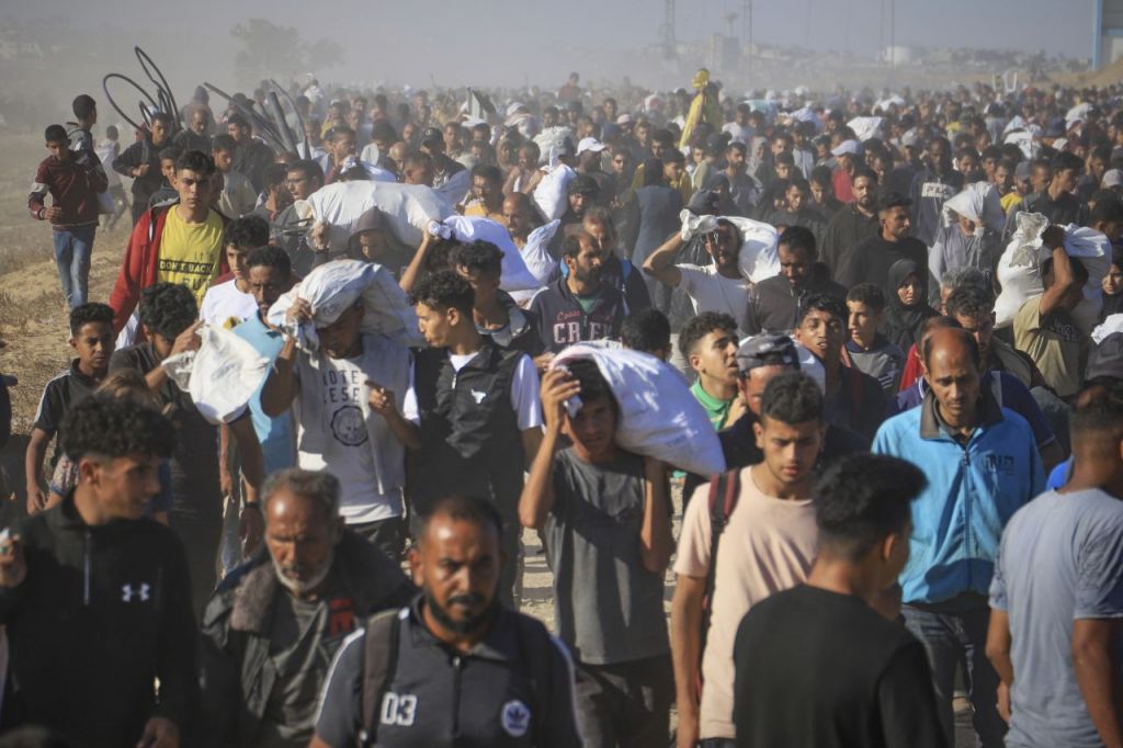 팔레스타인 가자지구 남부 라파로 들어온 피란민들이 가자 인도주의 재단(GHF)이 배급한 식량을 받고 있다. AP연합뉴스
