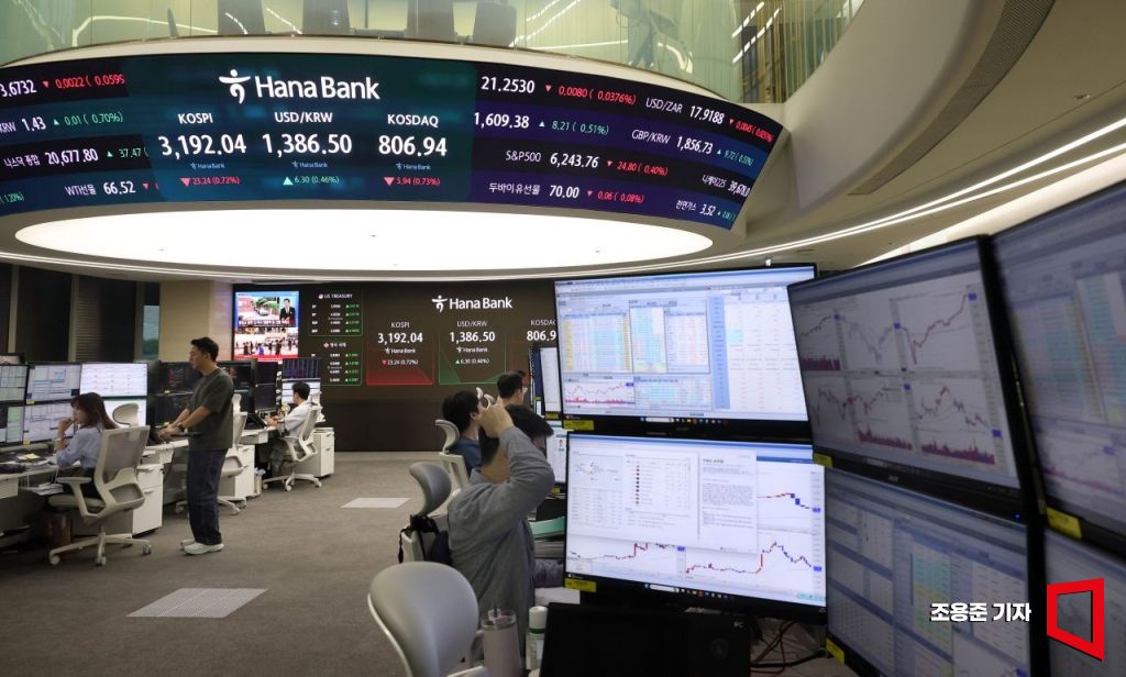 코스피지수가 하루만에 3,200선이 무너진 16일 서울 중구 하나은행 딜링룸 모니터에 코스피를 비롯해 원/환율, 코스닥 지수가 표시돼 있다. 이날 코스피는 전 거래일 대비 0.24% 내린 3207.48에 코스닥지수도 0.34% 내린 810.09로 시작해 하락폭을 키우고 있다.