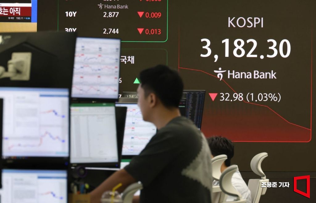 코스피지수가 하루만에 3,200선이 무너진 16일 서울 중구 하나은행 딜링룸 모니터에 코스피를 비롯해 원/환율, 코스닥 지수가 표시돼 있다. 이날 코스피는 전 거래일 대비 0.24% 내린 3207.48에 코스닥지수도 0.34% 내린 810.09로 시작해 하락폭을 키우고 있다.