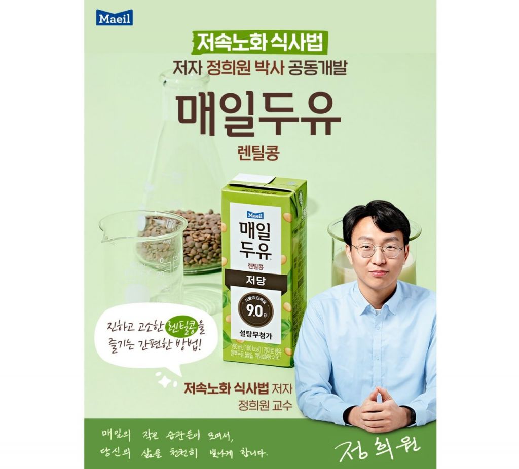 정 박사는 저속노화 식사법에서 렌틸콩의 영양적 가치를 강조한 바 있다. 또한 평소에도 식물성 단백질 섭취를 위해 설탕이 무첨가된 저당 두유를 즐겨 마시는 것이 알려지면서 매일유업과 이번 렌틸콩 두유를 공동 설계하는 인연으로 이어졌다. 매일유업은 정 박사와 개발과정에서 영양설계와 원료 배합비율, 맛까지 긴밀한 협업을 통해 신제품 매일두유 렌틸콩을 탄생시켰다.