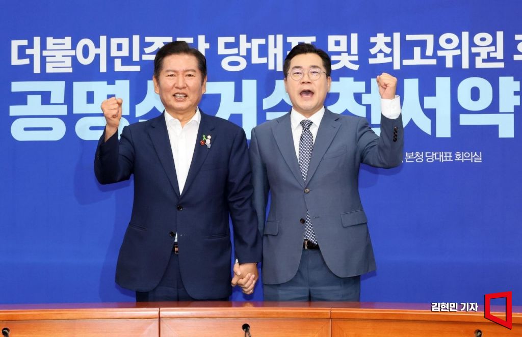 정청래·박찬대 더불어민주당 당대표 후보가 15일 국회에서 열린 공명선거 실천 서약식에서 기념촬영을 하고 있다. 2025.7.15 김현민 기자