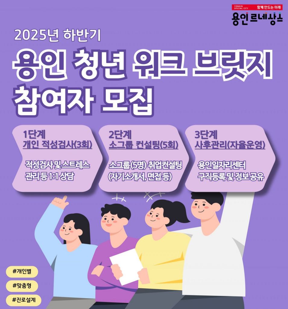 경기도 용인시는 미취업 청년들의 진로 설계를 맞춤형으로 지원하는 '청년 워크 브릿지' 참여자를 오는 25일까지 모집한다.