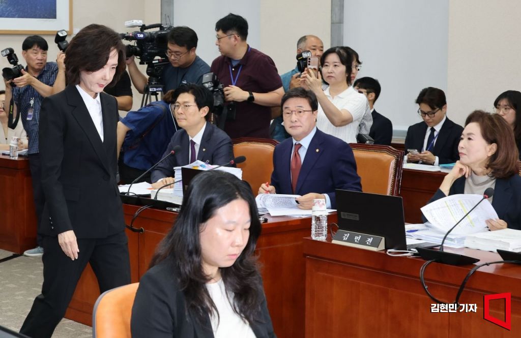 이진숙 사회부총리 겸 교육부 장관 후보자가 16일 국회 교육위원회에서 열린 인사청문회에서 김영호 위원장에게 선서문을 제출한 뒤 자리로 돌아가고 있다.