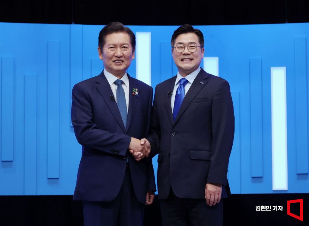정청래·박찬대 더불어민주당 당대표 후보가 16일 서울 양천구 목동 SBS에서 열린 TV토론회에 앞서 기념촬영을 하고 있다. 2025.7.16 김현민 기자