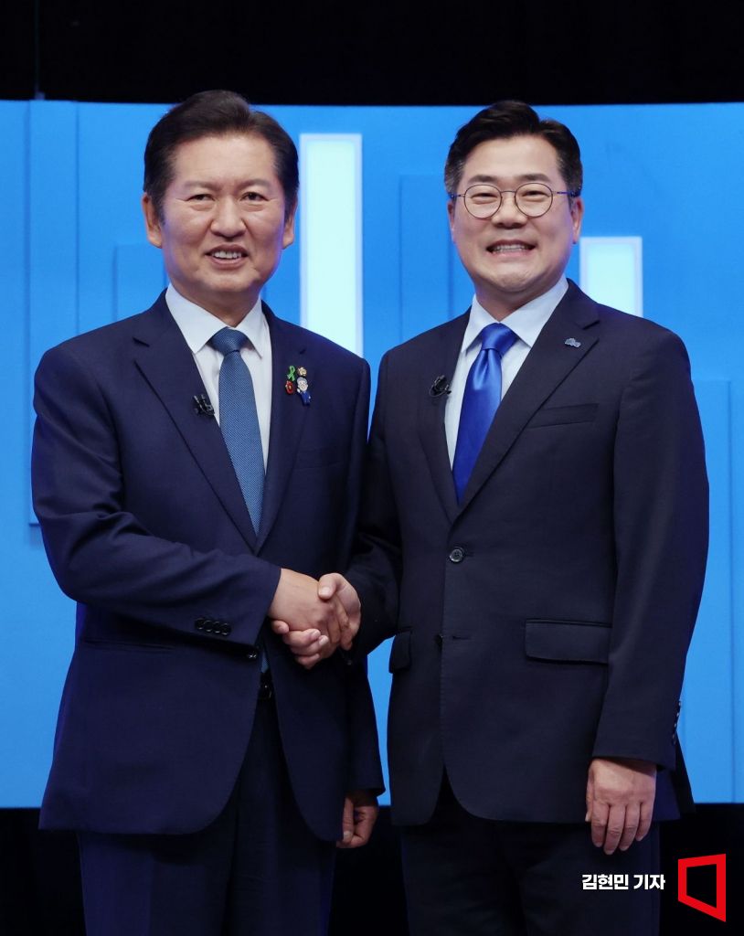 정청래·박찬대 더불어민주당 당대표 후보가 16일 서울 양천구 목동 SBS에서 열린 TV토론회에 앞서 기념촬영을 하고 있다. 2025.7.16 김현민 기자