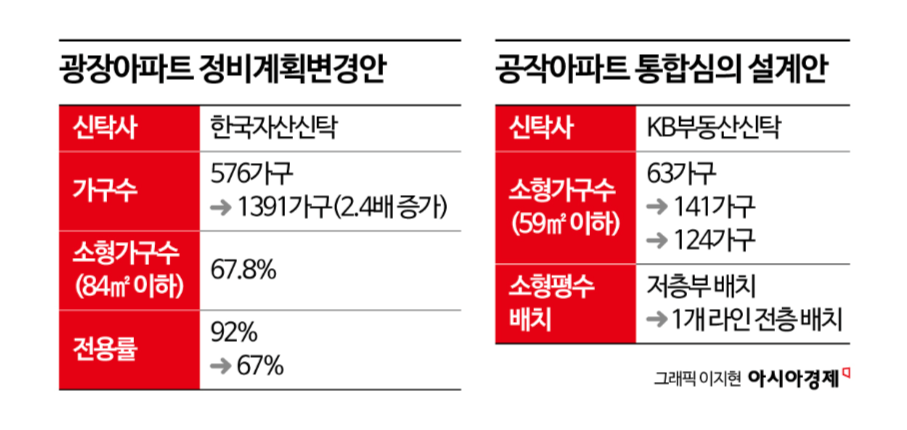 공정추는 KB부동산신탁이 소유주 전체 동의 없이 소형 평형 가구 수를 확대하고, 59㎡를 한 동에 한 라인으로 전층 배치하는 방식으로 설계를 변경했다며 반발했다. 당초 시공사인 대우건설이 입찰 당시 제시한 설계안은 25평(전용 59㎡)이 63가구, 41평 이상 대형 평형이 191가구였다. 그러나 KB부동산신탁은 59㎡를 141가구로 늘리고, 대형은 124가구로 축소했다.