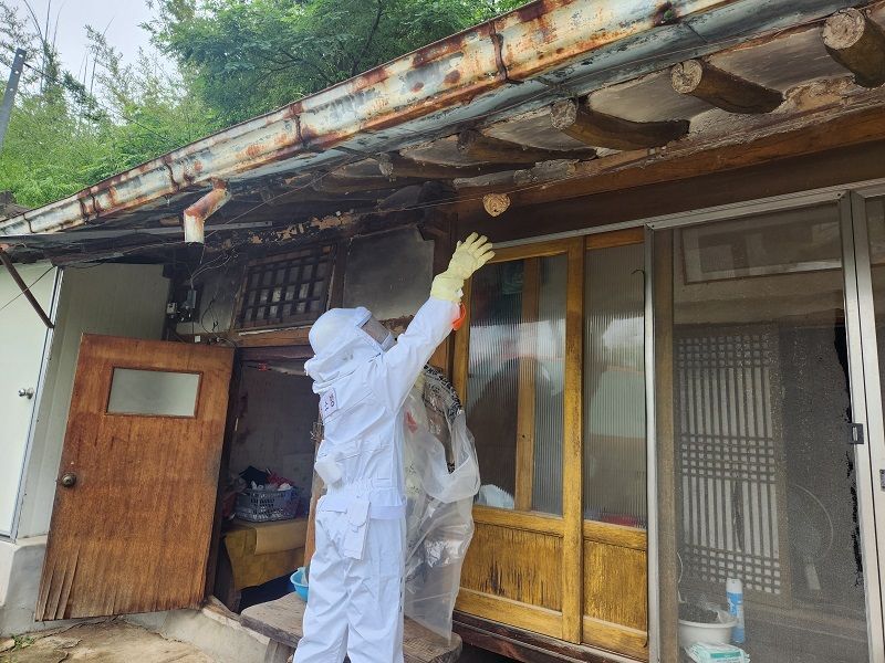 경북 소방대원들이 가정집에서 처마밑에 벌집을 제거하고 있다.