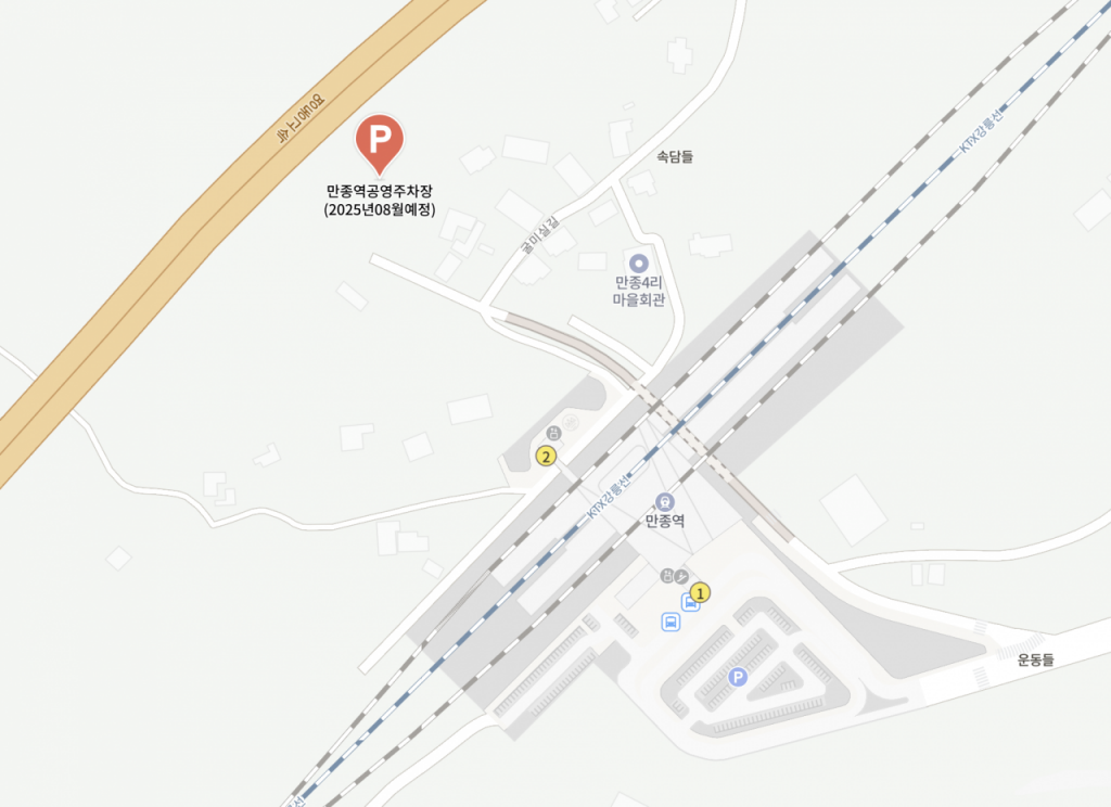 17일 운영을 시작한 원주시 KTX만종역 공영주차장 위치. 네이버 지도에는 8월 준공 예정으로 나와 있지만 원주시는 만종역 이용객들의 불편을 해소하고자 예정보다 앞당겨 준공했다. 이미지=네이버지도.
