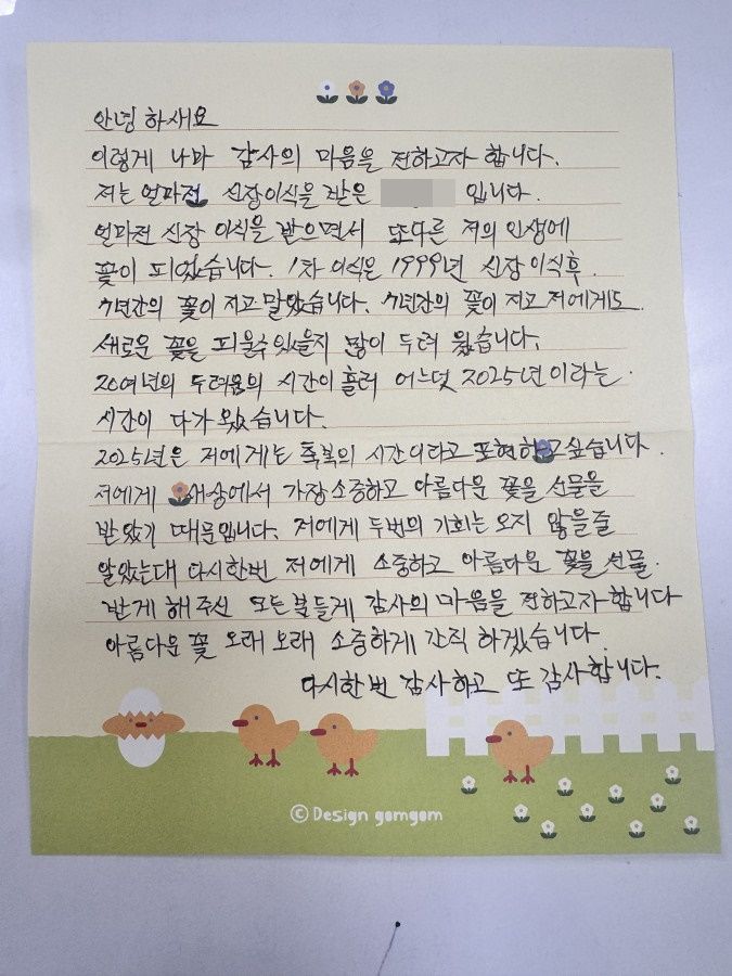 서울성모병원은 두번째 신장이식 수술로 새 삶을 시작한 50대 여성 경모씨가 감사 편지를 전했다고 17일 밝혔다.