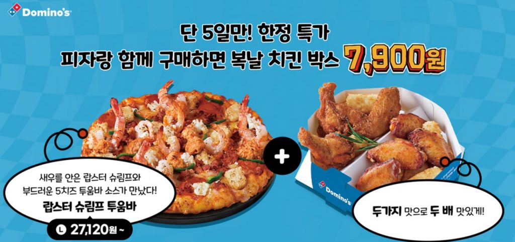 도미노피자 관계자는 "올해 첫 복날을 앞두고 치킨메뉴로 구성한 '복날 치킨 박스'를 선보였다"며 "이번 여름 신제품인 '랍스터 슈림프 투움바' 피자와 함께 도미노피자만의 다양한 치킨 요리가 담긴 치킨 박스도 즐겨 보시길 바란다"고 말했다.