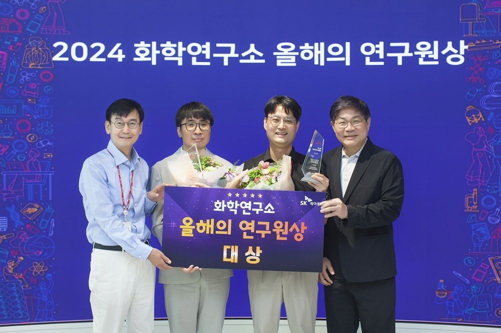 SK케미칼은 17일 경기 성남시 판교 에코랩(ECOLAB)에서 '제8회 올해의 연구원상' 시상식을 열고, 주력 제품 경쟁력 강화에 기여한 3개 연구팀을 수상자로 선정했다고 밝혔다. 올해 시상은 기존 1팀 선정 방식에서 확대해 대상 2팀(4명), 장려상 1팀으로 구성됐다.