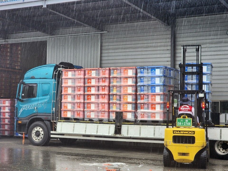 경남 함양에 위치한 희망브리지 재해구호물류센터에서 이재민 구호키트를 운송 차량에 적재하고 있다. 희망브리지