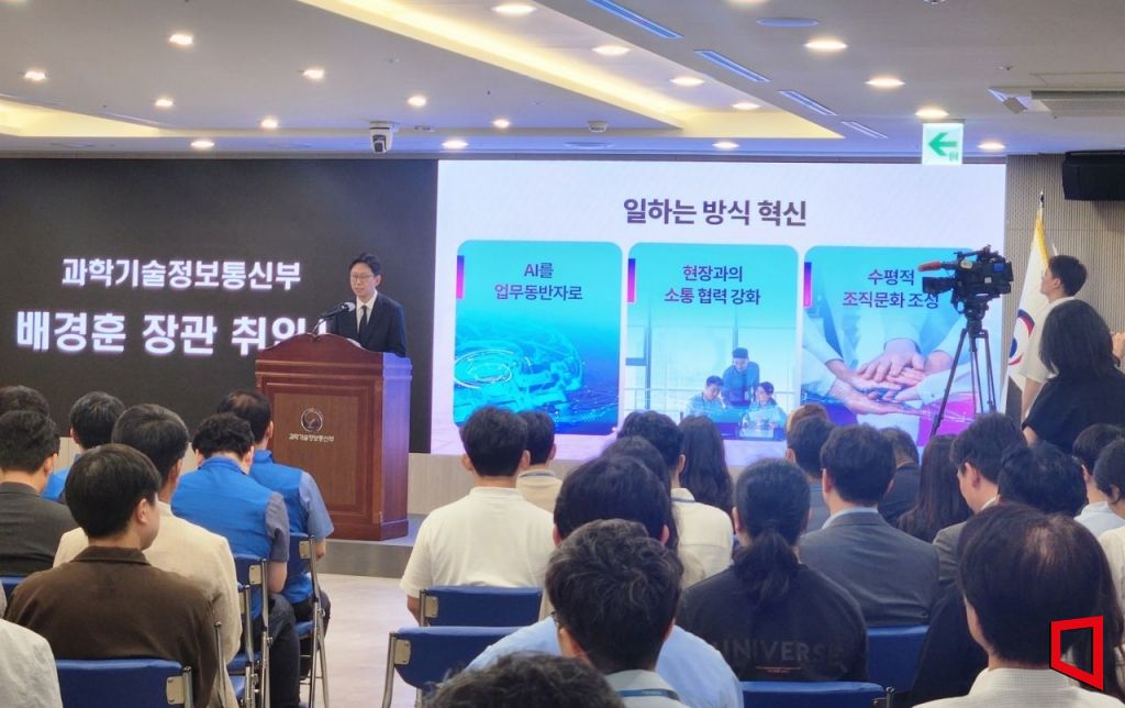 배경훈 신임 과학기술정보통신부 장관이 17일 취임 직후 타운홀 미팅을 열고 "AI 기반의 국가 대전환을 통해 '진짜 대한민국'을 실현하겠다"고 밝혔다. 민간 기업인 출신답게 행사 방식부터 이례적이었다. 정형화된 착석 대신 반원형 좌석에 직접 만든 프레젠테이션(PPT)을 띄우고, 직원들과 직접 마주 앉아 자유로운 질의응답을 이어갔다. 기존 관료 문화와는 결이 다른, '일하는 방식의 전환'을 상징하는 장면이었다는 평가가 나온다.