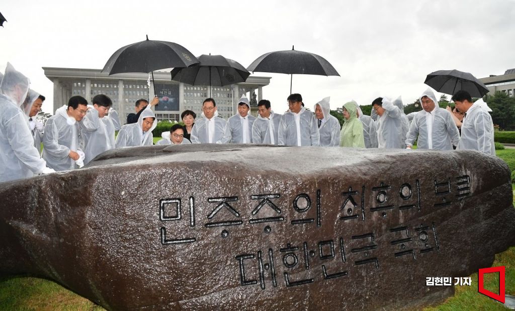 우원식 국회의장이 17일 국회 잔디마당에서 열린 제77주년 제헌절 기념 상징석 제막식에서 상징석 글귀를 읽고 있다. 상징석에는 국회가 민주주의의 보루로서 '12·3 비상계엄' 해제를 이끌었다는 내용의 문구가 새겨져 있다.