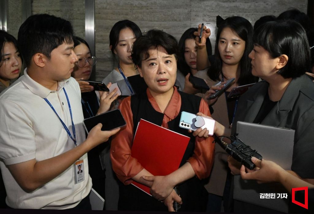 윤희숙 국민의힘 혁신위원장이 17일 국회에서 열린 비상대책위원회의에 참석한 뒤 나와 취재진의 질문을 받고 있다. 윤 위원장은 전날 나경원·윤상현·장동혁 의원과 송언석 비대위원장에게 거취 결정을 요구하는 인적쇄신안을 발표했다.