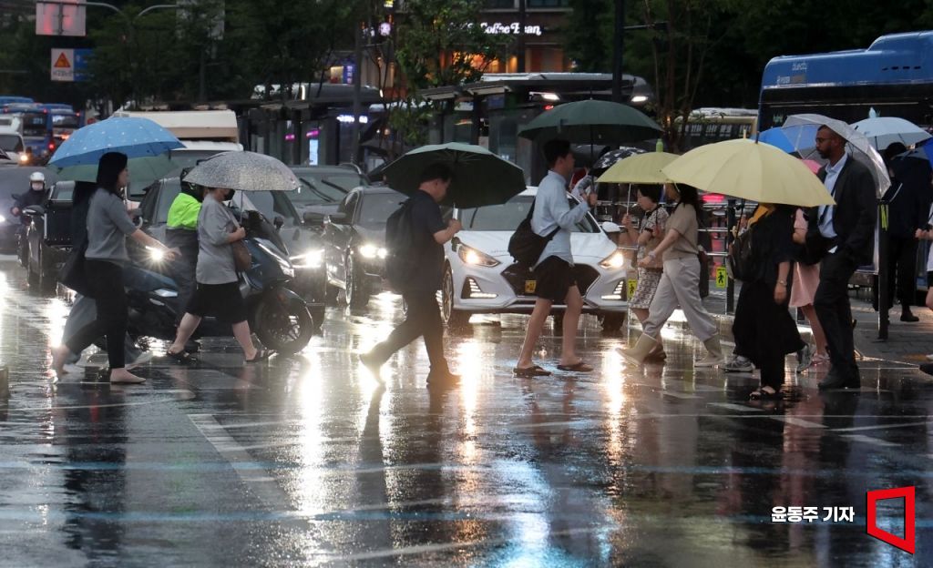 수도권과 중부지방을 중심으로 강한 비가 내린 17일 서울 광화문 사거리를 지나는 시민들이 우산과 장화 등으로 무장한체 발걸음을 서두르고 있다. 2025.07.17 윤동주 기자