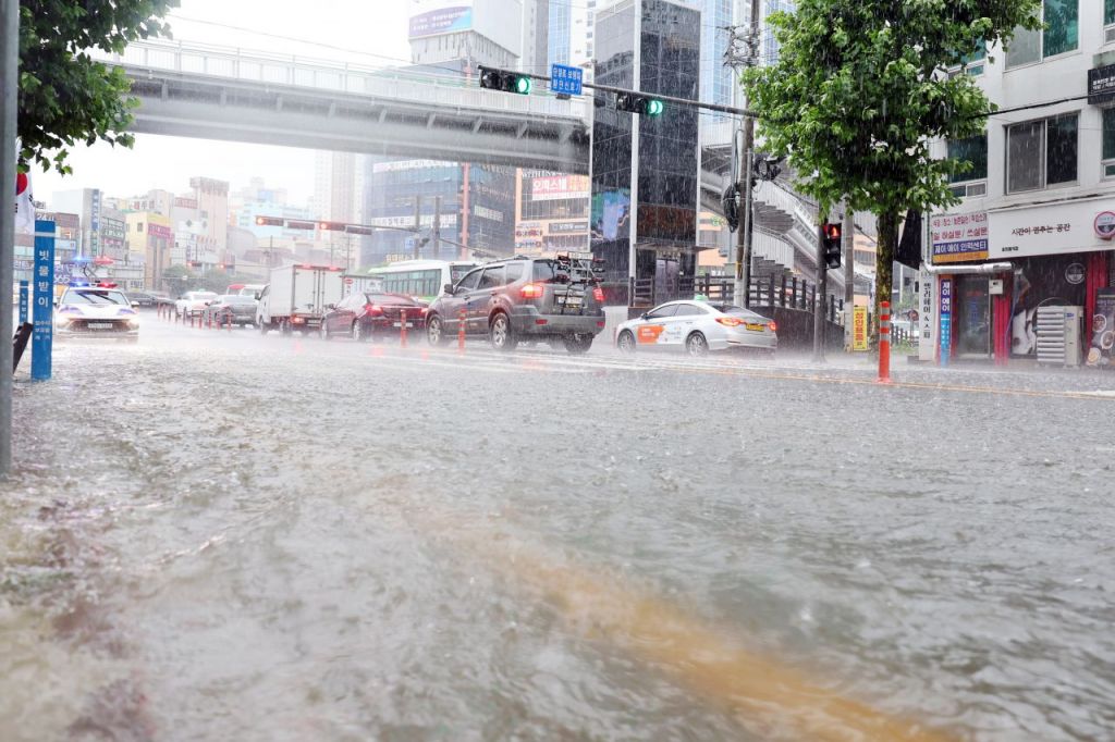 호우경보가 발효된 17일 오전 광주 남구 백운광장 인근 도로가 물에 잠겨 있다. 연합뉴스
