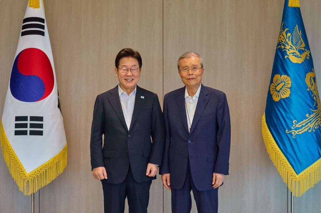 이재명 대통령이 17일 서울 용산 대통령실 청사에서 김종인 전 국민의힘 비상대책위원장을 만나 기념촬영을 하고 있다. 연합뉴스