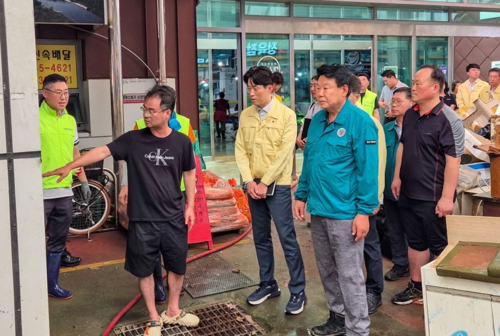 노용석 중소벤처기업부 차관이 17일 충남 당진전통시장을 방문해 집중호우 피해 상황을 점검하고 있다. 중소벤처기업부