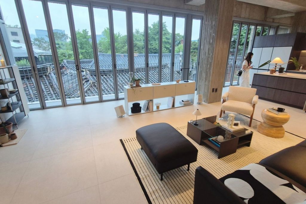 2층 '스타일링 스튜디오'에는 좌측 폴딩 도어 너머로 한옥 지붕이, 우측에는 '오늘의집 키친' 등 현대식 인테리어가 어우러진다. 사진=최호경 기자