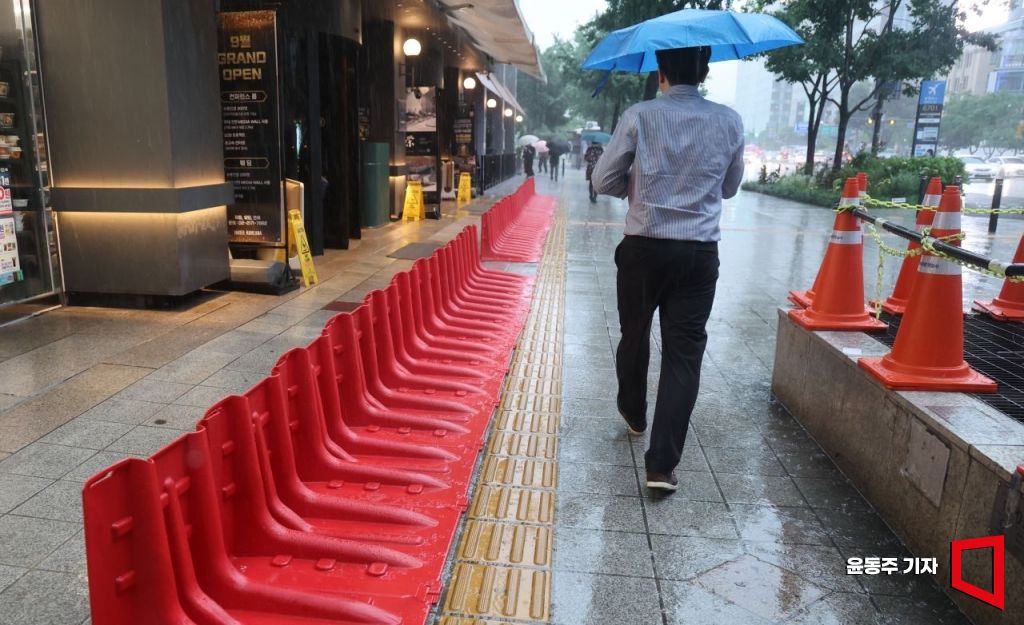 수도권과 중부지방을 중심으로 강한 비가 내린 17일 서울 광화문 사거리에 위치한 한 빌딩 출입구 침수를 대비한 시설물이 설치되어 있다. 2025.07.17 윤동주 기자