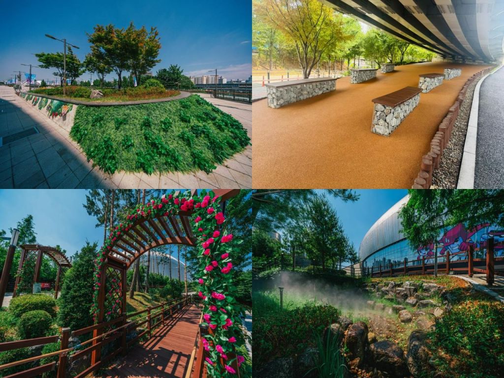 보행광장 상부에 마련된 ‘플라워가든’에는 약 20종의 꽃이 계절마다 다양한 색감을 연출한다. 하부 유휴공간에는 240㎡ 규모로 친환경 코르크 바닥과 유선형 벤치를 갖춘 ‘코르크 쉼터’가 들어섰다.