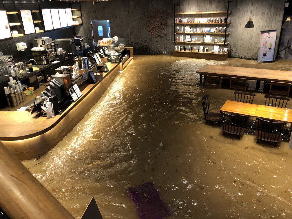 폭우로 침수된 광주 신안동의 한 커피전문점 내부. 흙탕물이 매장 전체를 뒤덮고 있다.