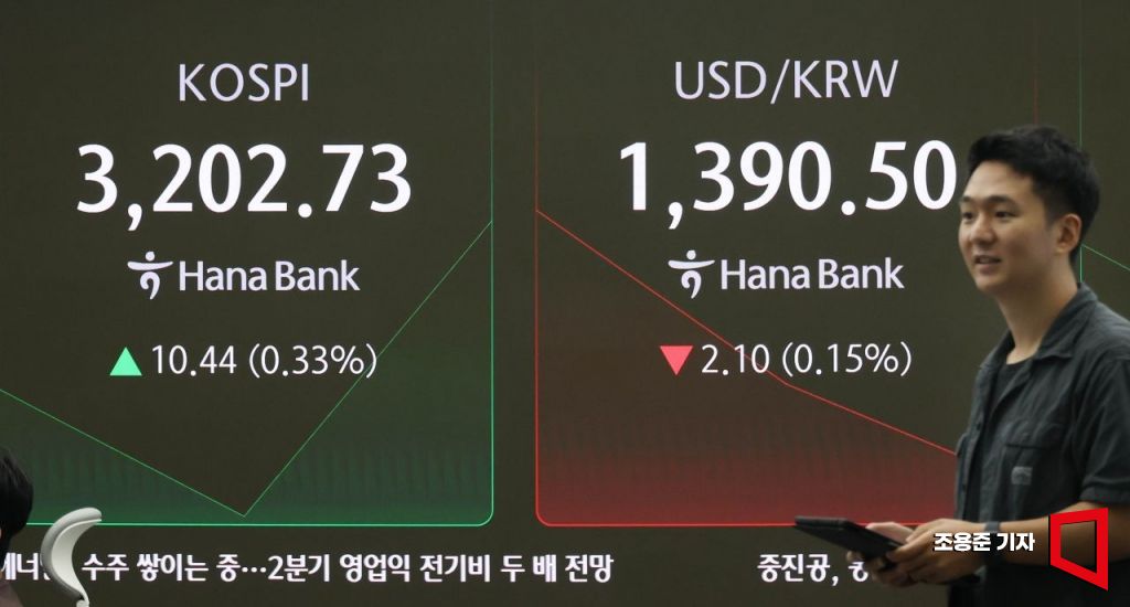 미 나스닥이 사상최고치로 마감한 가운데 코스피지수도 3200선을 회복하며 출발한 18일 서울 중구 하나은행 딜링룸 모니터에 코스피를 비롯해 원/환율 등이 표시돼 있다. 이날 코스피는 전장보다 8.15포인트(0.26%) 오른 3200.44 시작해 강보합을 이어가고 있다.