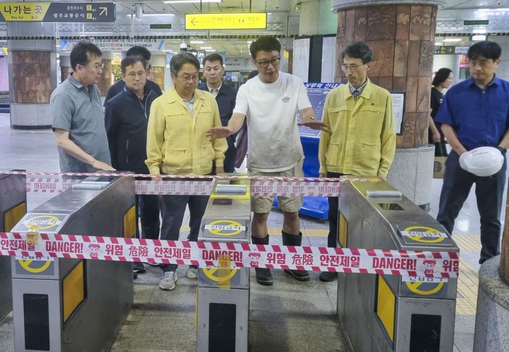 강기정 광주시장이 18일 오전 폭우로 침수 피해를 입은 광주 지하철 1호선 상무역을 찾아 피해 복구 상황을 점검하고 있다. 긴급 복구를 마친 광주 지하철은 전 구간 정상 운행에 들어갔다. 광주시 제공