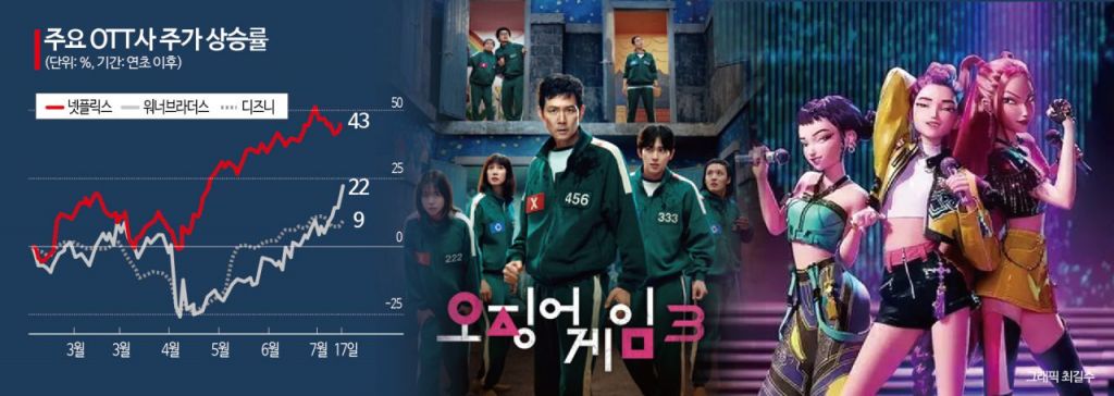 세계 최대 온라인동영상서비스(OTT) 기업인 넷플릭스가 시장 예상치를 웃도는 2분기 매출을 발표하며 한국 콘텐츠의 인기가 실적에 긍정적인 영향을 미쳤다고 밝혔다. 이에 뉴욕증시에서 넷플릭스의 시가총액은 경쟁사인 월트디즈니의 두 배를 뛰어넘었다.