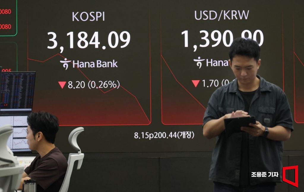 18일 서울 중구 하나은행 딜링룸 모니터에 코스피를 비롯해 원/환율 등이 표시돼 있다. 이날 코스피는 전장보다 8.15포인트(0.26%) 오른 3200.44 출발했지만 10시 현재 하락세를 이어가고 있다. 2025.7.18 조용준 기자