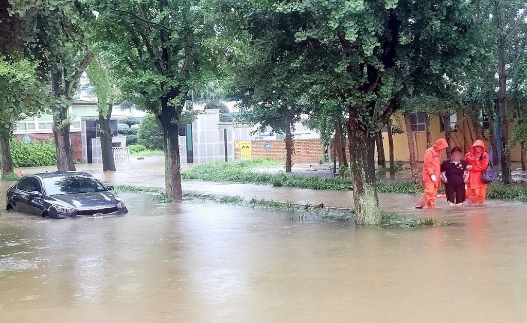 호우 특보가 발효된 지난 17일 오후 전남 담양군 고서중학교 인근 도로가 물에 잠겨 소방 당국이 안전조치를 하고 있다. 연합뉴스