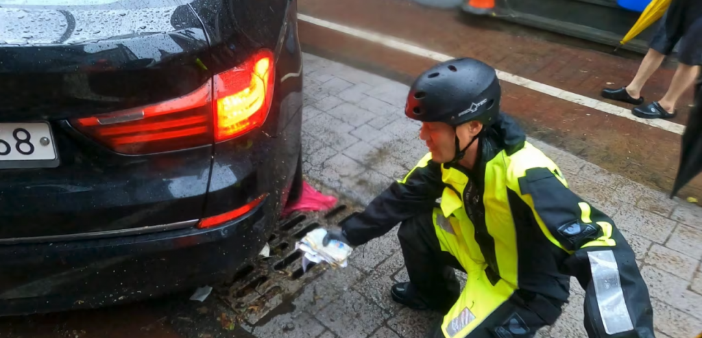 지난 17일 낮 12시 30분쯤 광주광역시 북구 중흥동 전남대 정문 도로에서 침수차량 배수작업하던 박선홍 소방위가 유실된 현금봉투를 발견한 모습. 광주 북부소방서