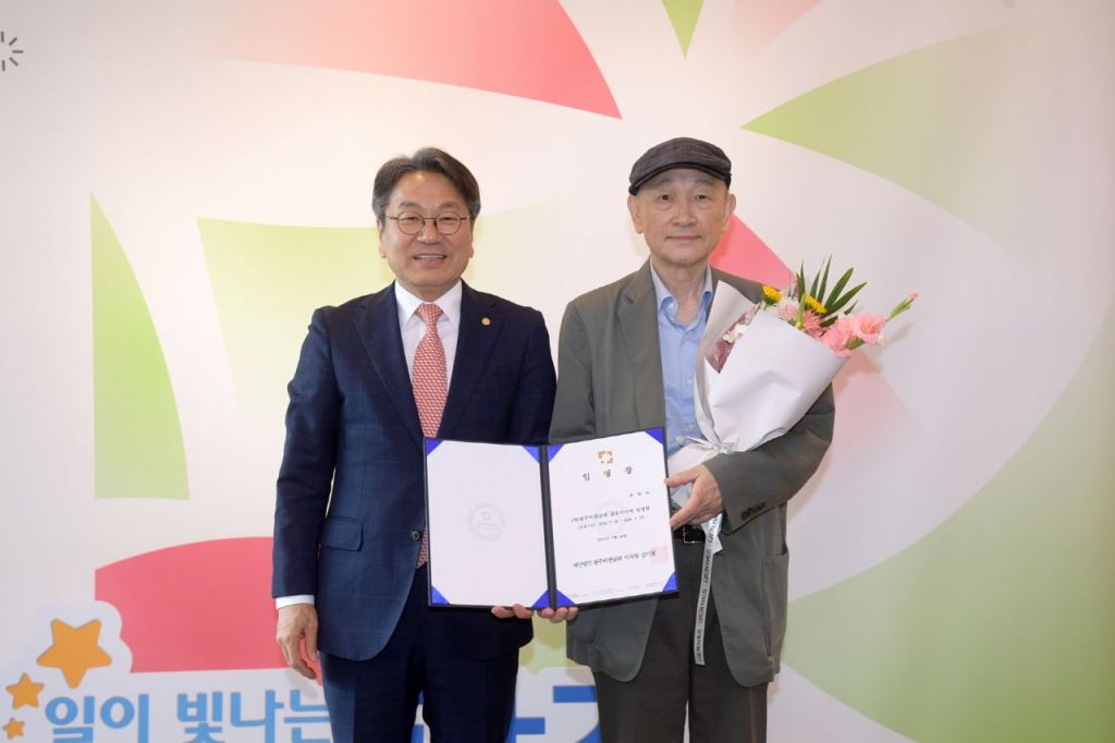 강기정 광주시장이 18일 오후 시청 접견실에서 윤범모 광주비엔날레 대표이사에게 임명장을 수여한 후 기념촬영을 하고 있다. 광주시 제공