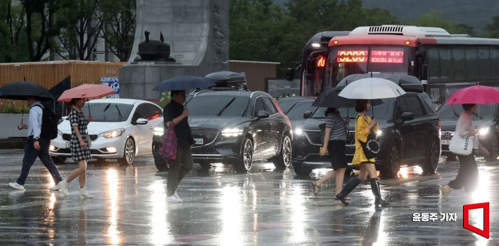 수도권과 중부지방을 중심으로 강한 비가 내린 17일 서울 광화문 사거리를 지나는 시민들이 우산과 장화 등으로 무장한체 발걸음을 서두르고 있다. 2025.07.17 윤동주 기자