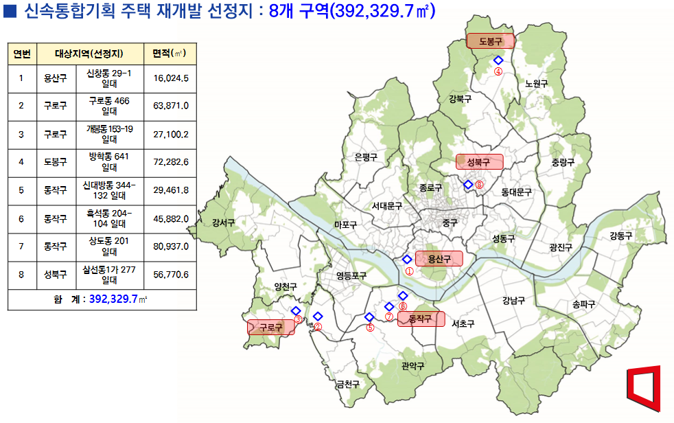 서울시가 신속통합기획 후보지 8곳과 기존 신통기획·공공재개발 선정지를 토지거래허가구역으로 지정했다.