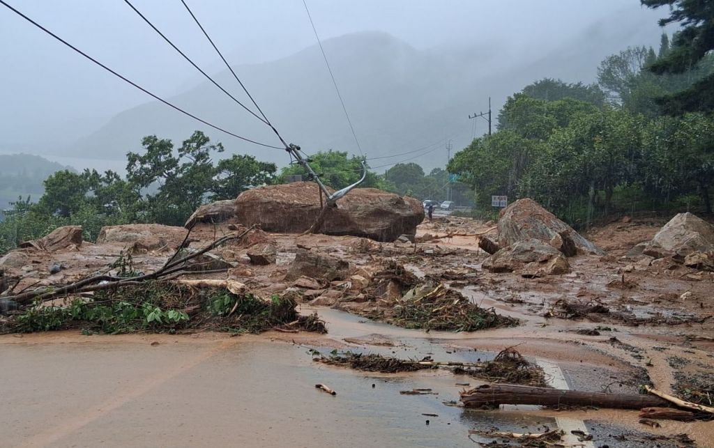 경남 산청군 지역에 폭우와 산사태가 발생한 19일 산청 시천면 지리산 주변 도로가 토사와 큰 바위, 나뭇가지, 전신주 등으로 막혀 있다. 연합뉴스