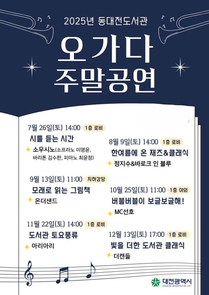 대전시가 시민들의 일상 속 문화 향유 기회를 확대하기 위해 동대전도서관에서 '오가다' 주말 공연을 7월부터 12월까지 매월 정기 운영한다.